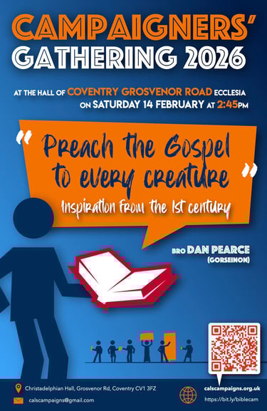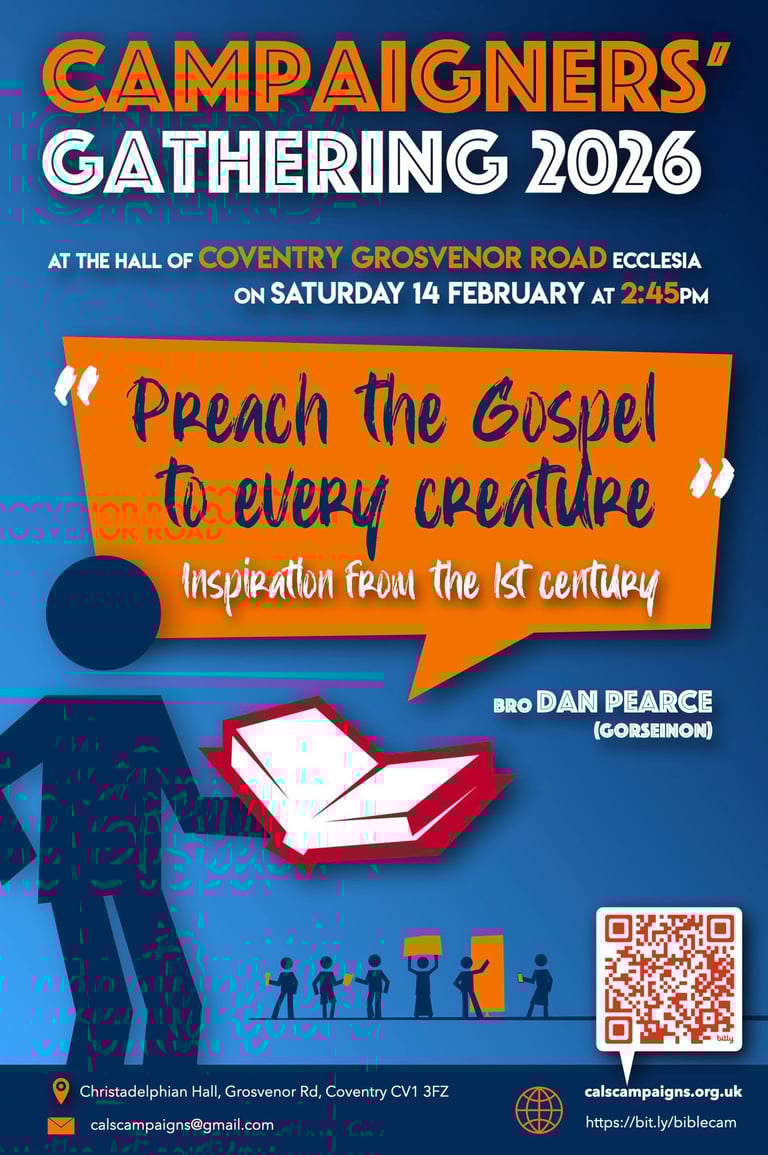 Stands and Stalls representing several Christadelphian organisations - open prior to the gathering and during tea interval. Please bring your own tea. Hot and cold drinks will be provided.
